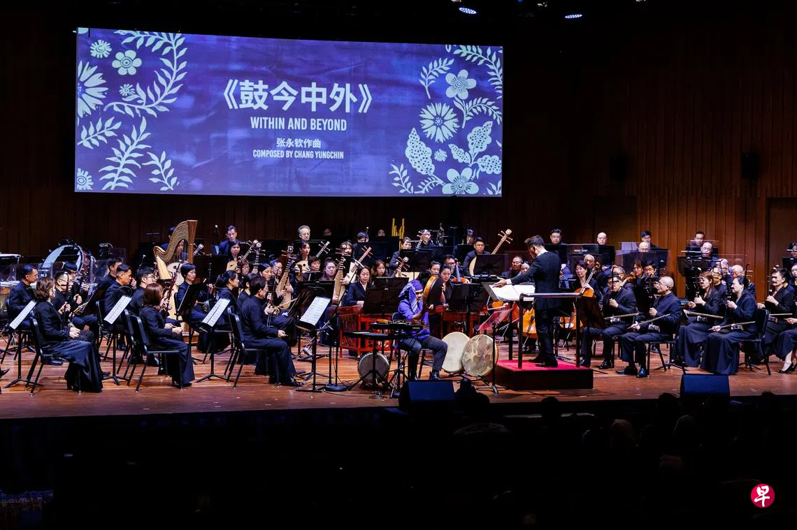 音乐会由驻团作曲家王辰威的《畅响狮城》开场。作品取材本地五大籍贯(闽、潮、粤、客、琼)音乐素材,特意展现南音琵琶、广东高胡、潮州大鼓等地域乐器风采。全曲以潮州“乱锣”拉开序幕,六段合奏与五段小组合交错展开,并置展现各地方风格。由演奏家录制的方言祝福穿插其间,既有形式上的巧思,也触发了在场许多观众的乡音共感。