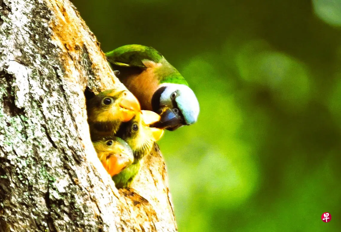 *注:鹦鹉和鸽子、斑鸠等鸟类一样,用“嗉囊乳”喂养幼雏。这种在嗉囊内壁分泌出来的分泌物,营养非常丰富。