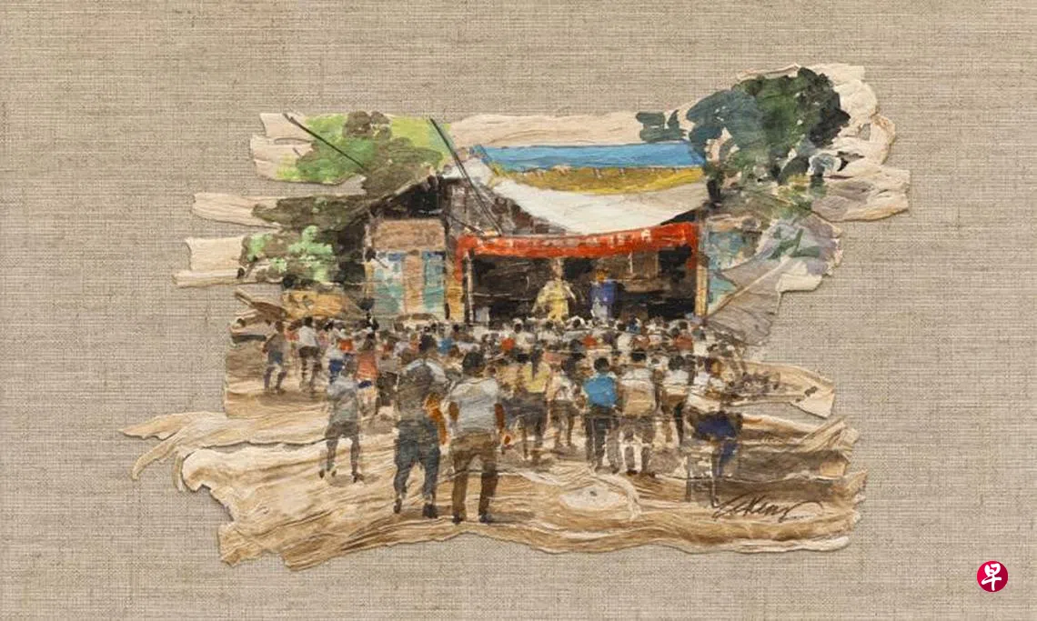 王金成说,桑皮纸的好处是怀旧的样子,令他联想到早期埃及的文字画在亚麻树皮上,与今天经过化学处理与机械制作的纸张大不同。他在皱巴巴的桑皮纸上回溯20世纪50及60年代在拉丁马士甘榜生活的记忆片段——学校、杂货店、道路,一幅幅像穴洞画残片。“这些是从记忆画出来的,但这些记忆并不连续,会中断、遗忘,仅有片段,不完整的,”他说。