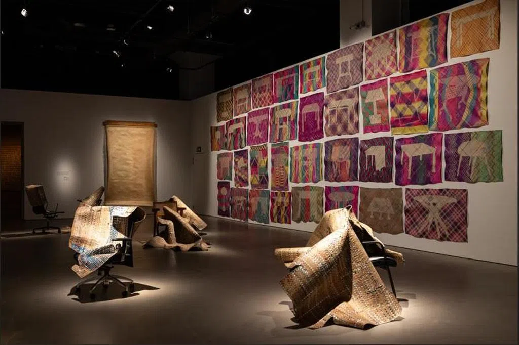 拉萨尔艺术学院纯美术硕士李炳源(Lee Pheng Guan,51岁)2023年驻留美术馆时,开展装置《漂亮,拜托(请你睡个好觉)》,通过少人关注、长在城市边缘地带的茅草,探讨新加坡花园景观的政治性。他在位于阿裕尼的工作室一带采集约40公斤干茅草,固定在坚硬的金属框架内,塑造成家具造型(如双人床、扶手椅)。头顶上方一束光,照亮白茅花的轮廓。