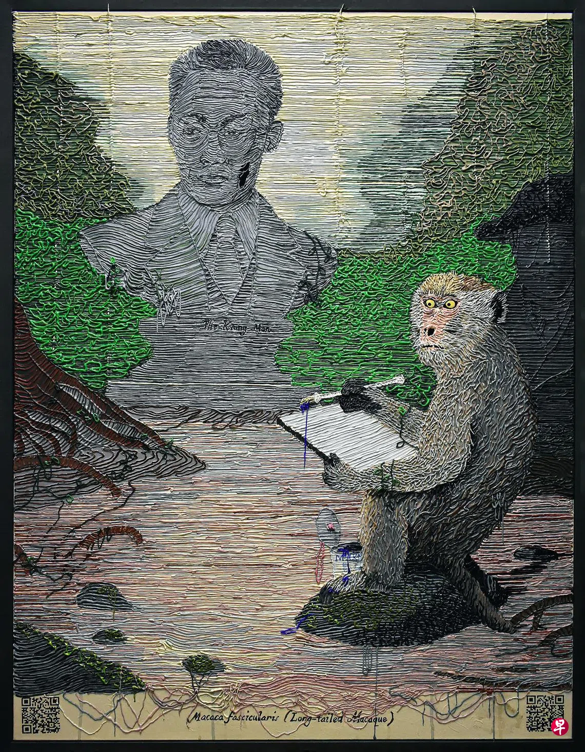 此外还有出生新加坡,随家人移民澳洲珀斯的马福民,其作品《活着,免租》借猕猴描绘一个形似李光耀的强者半身像,隐喻艺术家创作时面对恐惧下笔犹豫不决,并附上AI声音。希腊出生,以新加坡为基地的Emi Avora,专注于室内空间、静物与景观的描绘,作品《联系我们的日常秘密》展示花草围绕的阳台上的红塑胶椅。出生印尼、来新求学的Cynthia Delaney Suwito,通过装置《放东西的地方》借空间物品累积显示融入的过程。