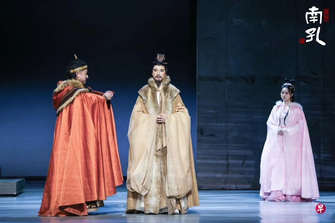 风靡中国的“新国风”音乐剧《南孔》将于10月登陆新加坡。这部由中国国家艺术基金重点扶持的作品,以孔子第53代孙孔洙“让爵”的史实为核心,采用“现实抉择”与“先祖对话”的双线叙事,展现儒家之“礼”的坚守与传承。故事源于靖康之变后的“大宗南渡”,延伸至元初孔洙拒绝忽必烈召令,择退隐江南的抉择,以个体命运折射儒学文脉的延续。