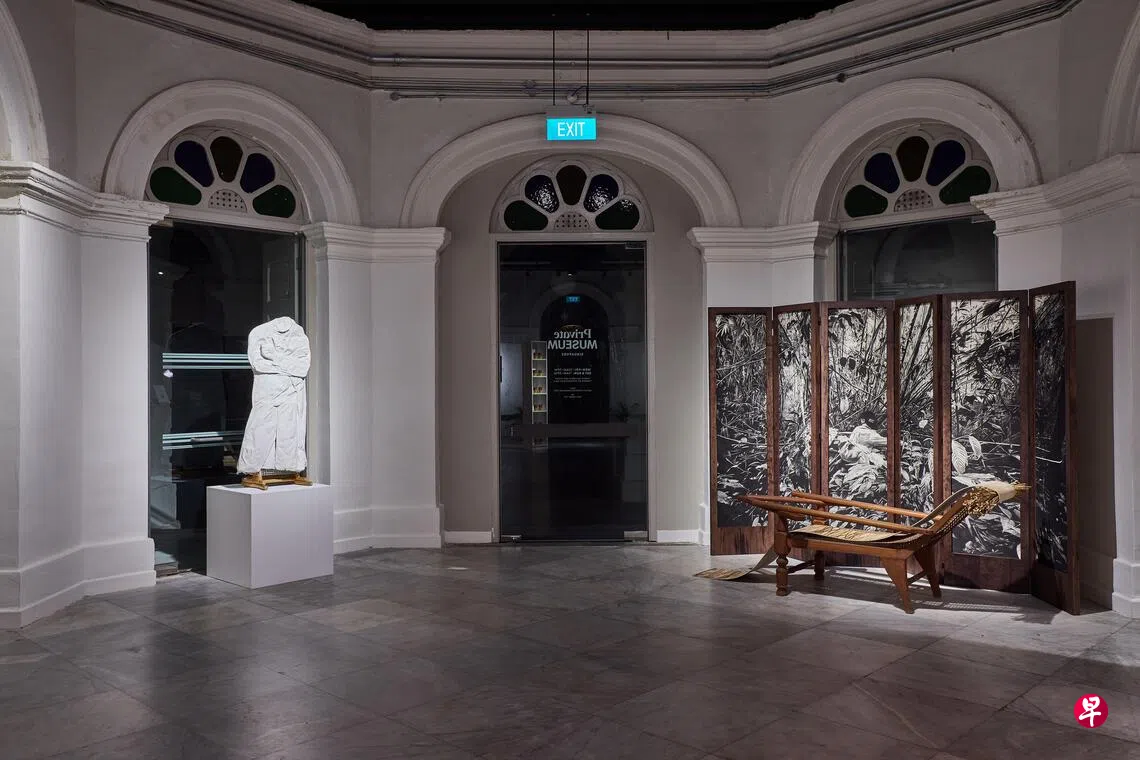 莱佛士爵士被艺术家王文清请下纪念碑基座,作品《莱佛士朱南(Raffles Chunam)》(2020)将肖像置在藤条支架上,肖像以纸浆制成的靠背套为基础,上面覆盖一度珍贵的莱佛士牌朱南(Chunam)灰泥石膏。如果帝国的标志可以重新制成容器和样品,那么它的象征力量就不是绝对的。策展人李鸿辉说,吸引他的作品都具备以下一个或多个特质:沉静的自信、局内人/局外人;重要的是,他们对新加坡的感受以及与新加坡的关系是多层次交织的。