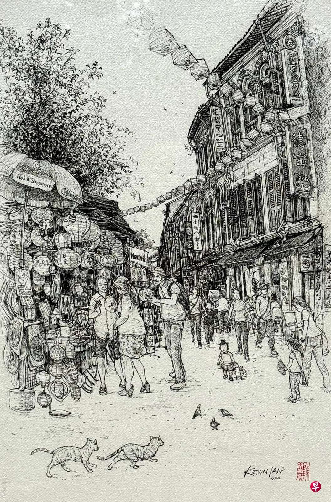 在展厅的拐角,我停下了脚步。那是熟悉的画风,是他当年沉静而细腻的笔触。 画中牛车水街道老旧,屋檐斜斜,两只猫追逐门前,灯笼摇曳,人潮在史密斯街交叉口穿行其间。 在画面中央,一名小女孩步履轻盈,手牵玩具车,眉眼清澈,仿佛将整座街市都抛在了身后。