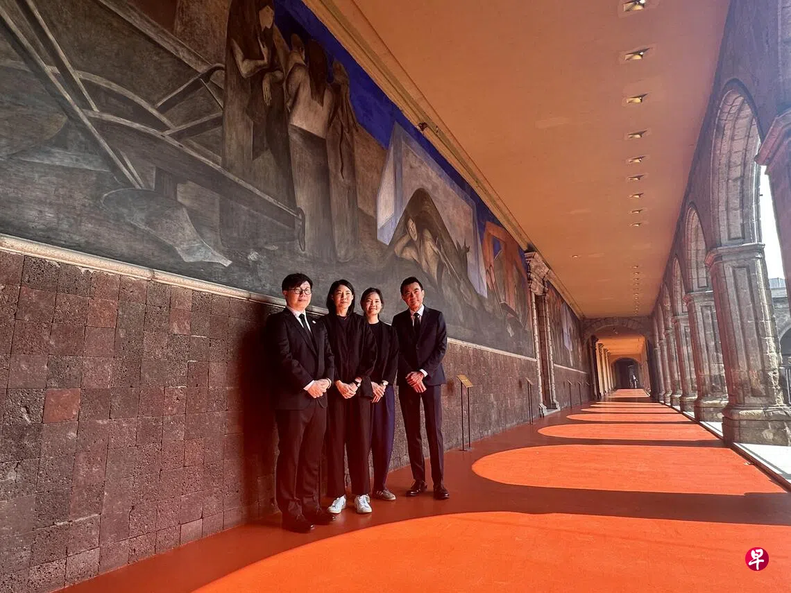 文化、社区及青年部代部长梁振伟12月4日为新加坡与墨西哥顶尖文化机构首办的大展“阿卡普尔科—马尼拉大商船:我们是太平洋,诞生于热带的世界”(El Galeón Acapulco – Manila. Somos Pacifico. El Mundo que emergió del Trópico)开幕致辞时,提到展地——墨西哥城圣伊德丰索学院(Colegio de San Ildefonso)是墨西哥壁画运动发源地。他站在学院内玻利瓦尔剧院舞台上,身后是墨西哥最著名的壁画家迭戈·里维拉(Diego Rivera,1886-1957)所作的第一幅壁画《创造》(1922)。