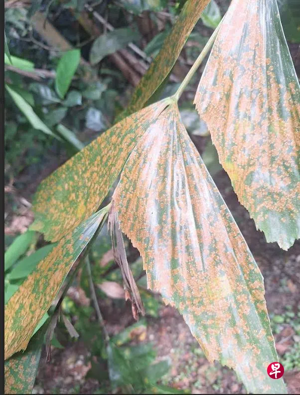 在榴梿叶和鱼尾棕的叶上,我都看见了如锈迹的黄色斑点,有的分布多,有的少,私以为这是叶子的老化过程,和人类一样,会经历初老、熟老的阶段。过后经查,才知也有可能感染了真菌,患上锈病或叶斑病。但即使感染真菌催叶老 ,这些看来布满形同人类老人斑的叶片,似乎不畏老,反展现老而健的精气神。真的,我轻抚叶片,仍能感受到它的生命力,如同人类中的老当益壮者。