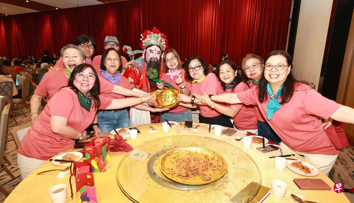 主办方新加坡华族文化中心2026年还推出新春特别活动,借鉴春节围炉传统,让陌生观众拼桌共餐,把传统演出玩出新花样。1月7日的活动约有430人到场参与,大家相约身穿新年红装,开启新年第一轮捞鱼生,边吃边唱贺岁歌曲。现场有不少子女携父母前来,各色方言联结不同人群。