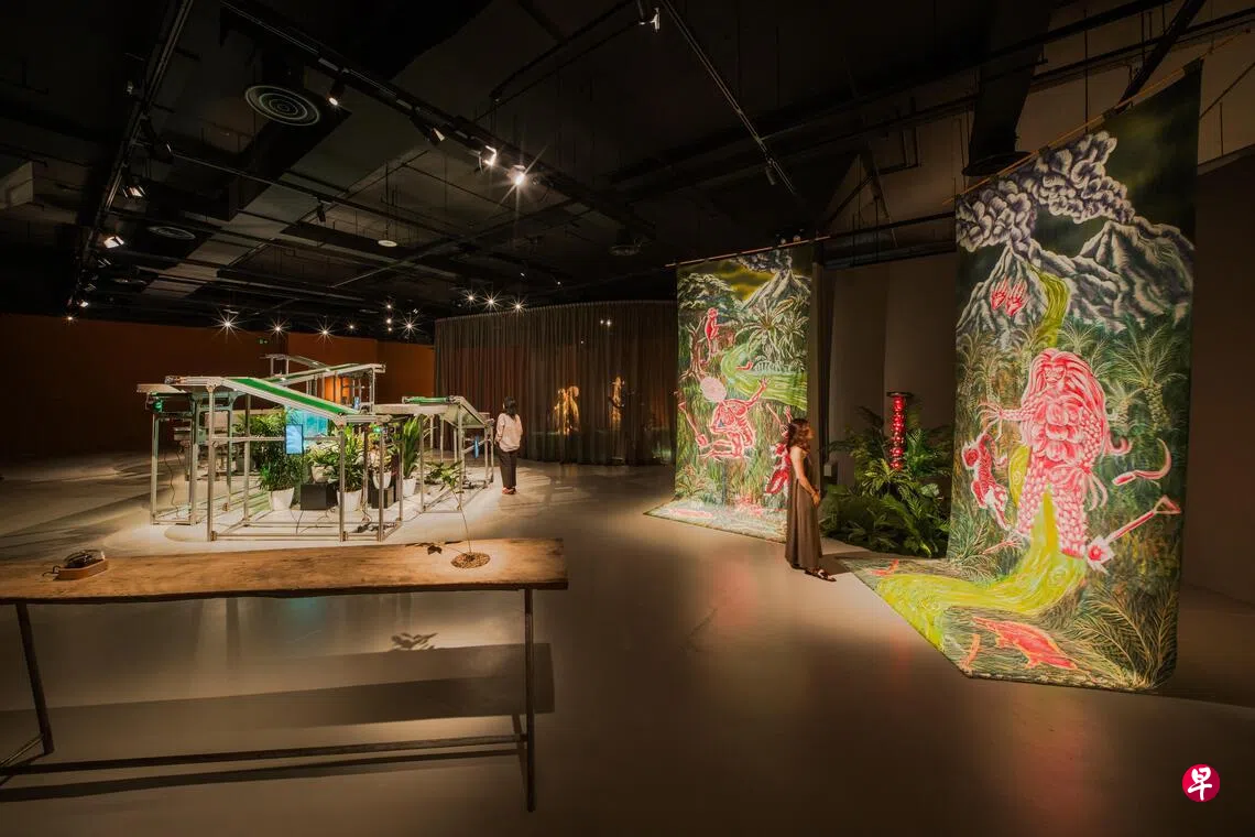 潘德加的动态装置融合模块化系统、科技、植物生物反馈和工业材料,探索印尼生态和社会政治景观中资源开采和环境破坏。在《地球织锦》(2025)中,一条缓慢移动的传送带循环播放根据受泗水泥石流灾害影响的社区绘制的3D打印雕塑。这些雕塑用灾区泥浆制成的线材打印而成,至今该灾区仍引发泥浆喷涌。《L.O.O.P(机械化操作流程)》(2026)呈现苏拉威西岛镍矿碎块沿10米长绿色传送带以稳定节奏移动,看似机械化,其节奏却非由机器设定,而是响应附近热带植物的生物反馈,显示自然过程影响系统运作。