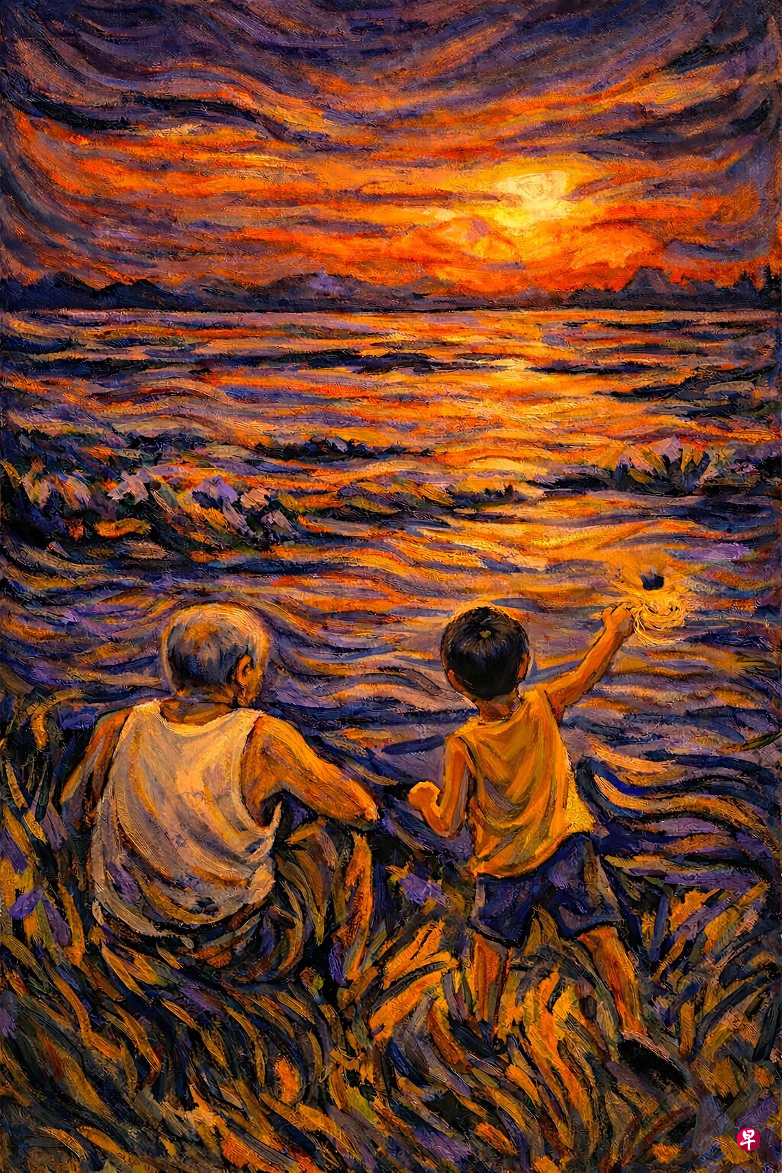 日落时看见你坐在河坡,我装作大人一样陪你沉思,装不下去时,就拿石头在水面上打出“轻功水上漂”给你看。但大部分时候我们不说话,河坡蟋蟀声淹没了我的耳朵。我还是孩子的时候,不止一次梦见河里有白龙,我还记得它雪亮的眼睛。