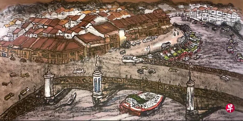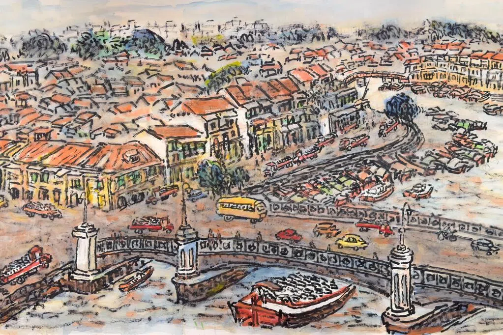 本次重点展品包括:纸本水墨《打铁街》特写甘榜格南与苏丹门一带,炉火旁的铁匠高举工具、专注劳作的身影;描绘“母亲河”的《新加坡河》(2000),呈现河边受保留建筑物与河面上往来繁忙的船只与人群身影,映照出河流在城市贸易、生活与历史记忆中的核心位置。