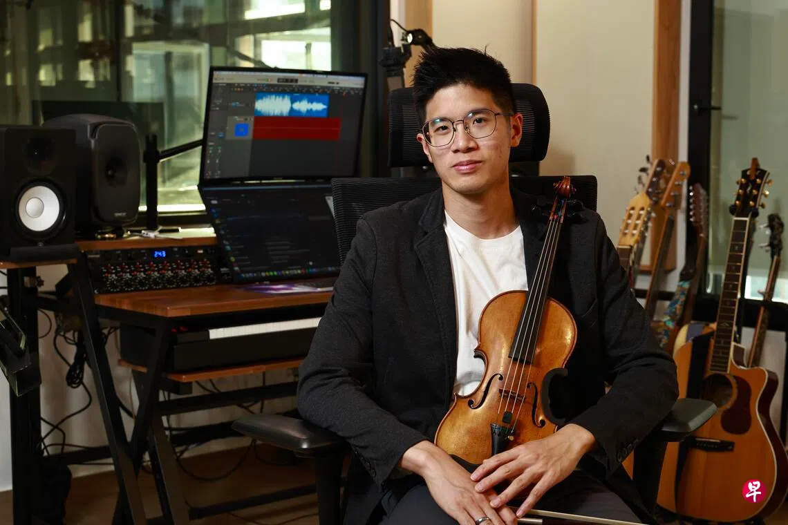 出生于1991年的陆凯源,很难被“小提琴家”或“作曲家”这样的传统标签定义。他本科毕业于杨秀桃音乐学院,师从著名小提琴家钱舟,接受严谨的古典演奏训练;之后赴耶鲁大学音乐学院深造,再后来进入新英格兰音乐学院学习爵士乐,逐渐走向创作。近来,他为2026年新加坡国际小提琴比赛创作了指定曲;与此同时,他作为乐团首席,刚刚结束为期一年、横跨亚洲各地的张学友巡回演唱会。工作室里许多乐器,正是在这段奔波旅途中收集到的。