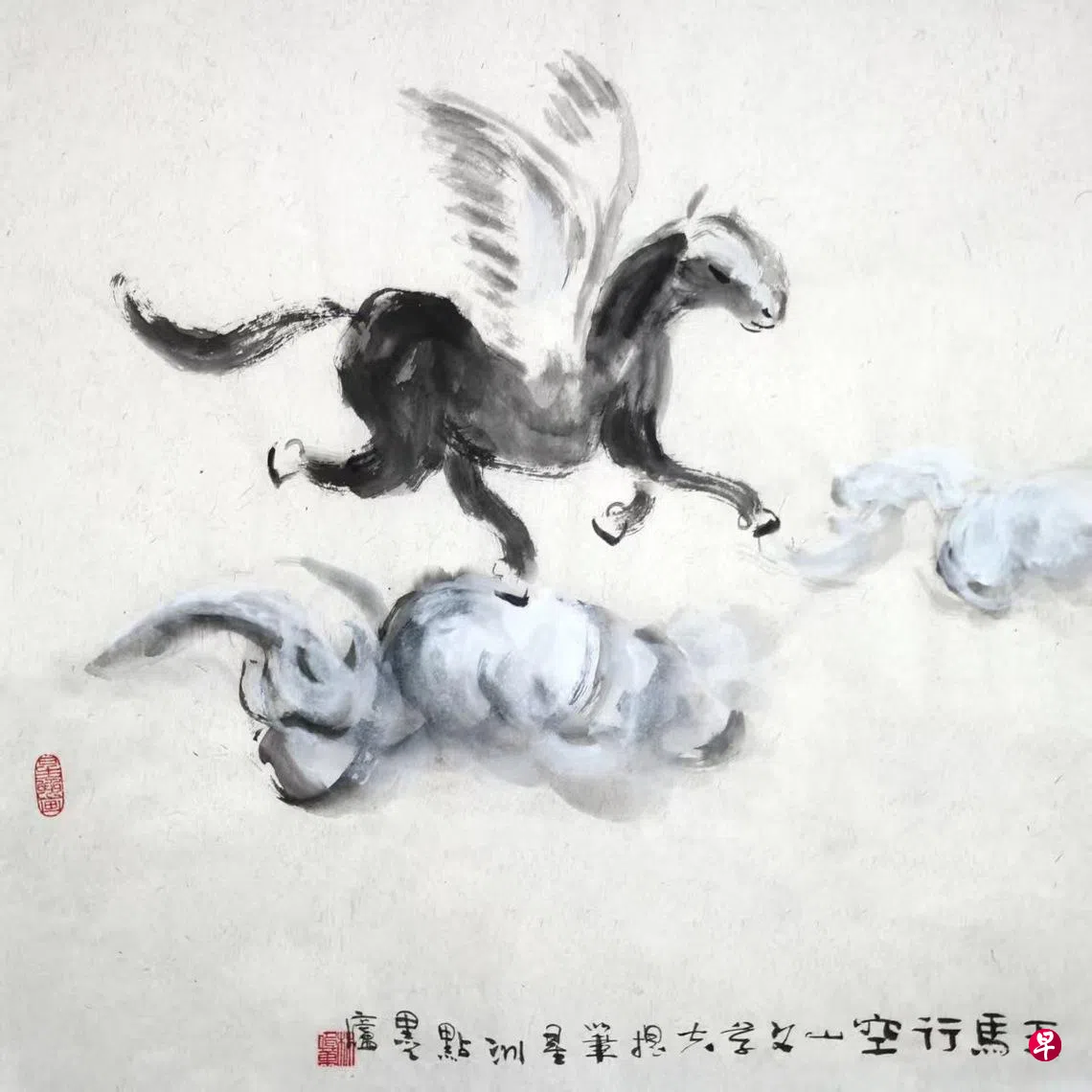 在西方,马常被人们神化,我们熟悉的有天马与独角兽。《天马行空》这一幅画里,我借用了西方有翅膀的天马,让它飞驰于白云之中。