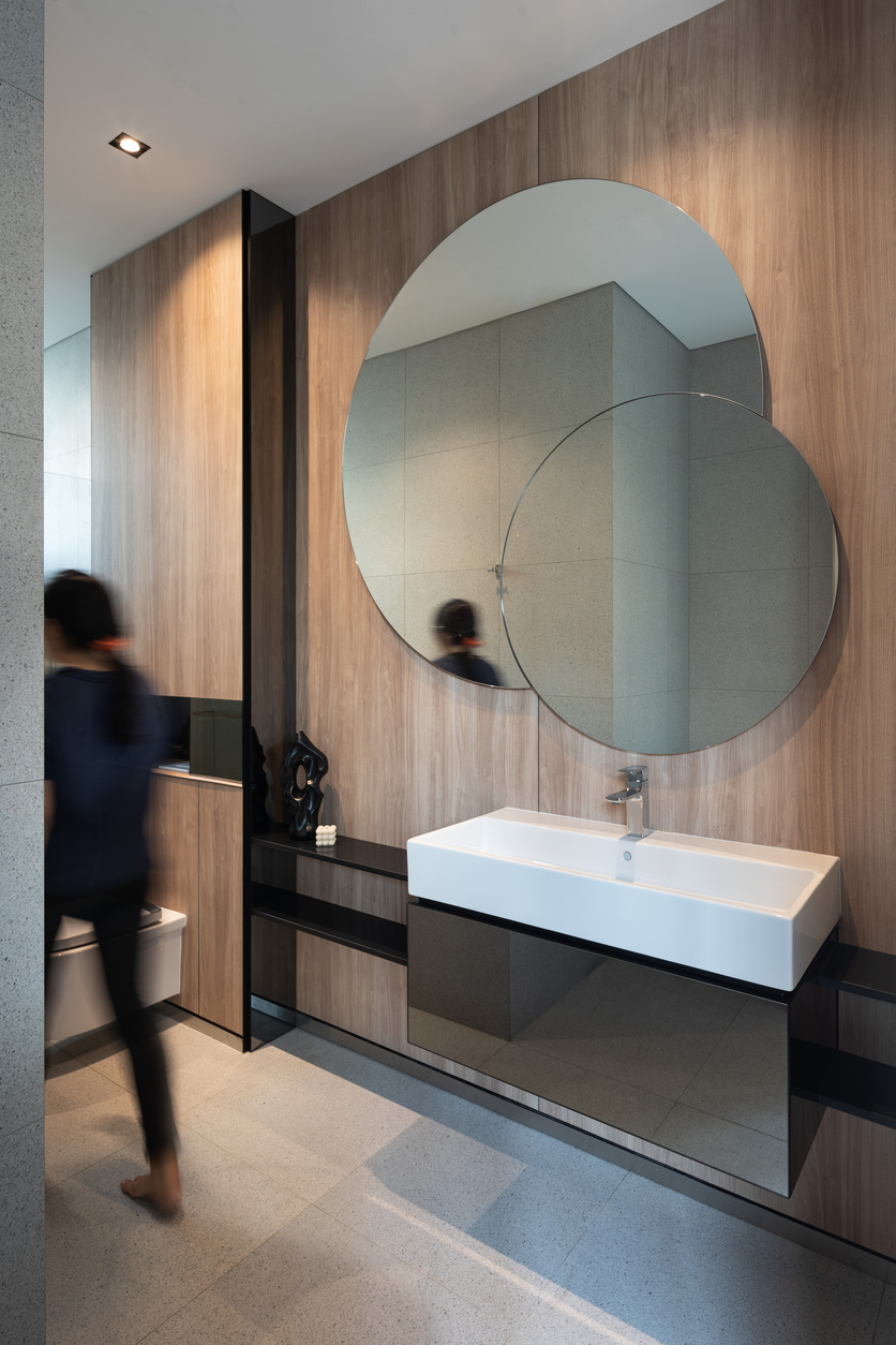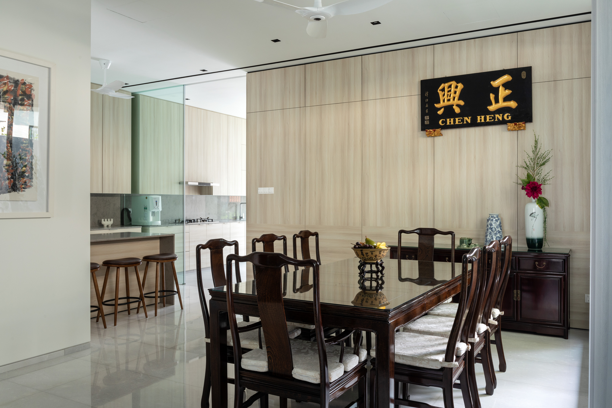 屋主藏有不少新马画家的书法作品,包括2003年文化奖得主林子平和2007年总统设计奖得主翁锡礼的画作,同时喜欢一些带有南洋风味的家具如黑木椅子和大理石桌子,像大门入口处的大理石圆桌是特别跟本地家具制造商Second Charm定制,建筑师得在装修时为这些物品找到一个新旧的共存空间。大厅非常显眼地雕刻着繁体“正兴”二字的中文牌匾,则是从上一代在武吉知马路上段经营的咖啡店保留下来,不仅成为独具特色的摆设,更时刻提醒屋主一家不能忘了上一辈的艰辛和刻苦耐劳。