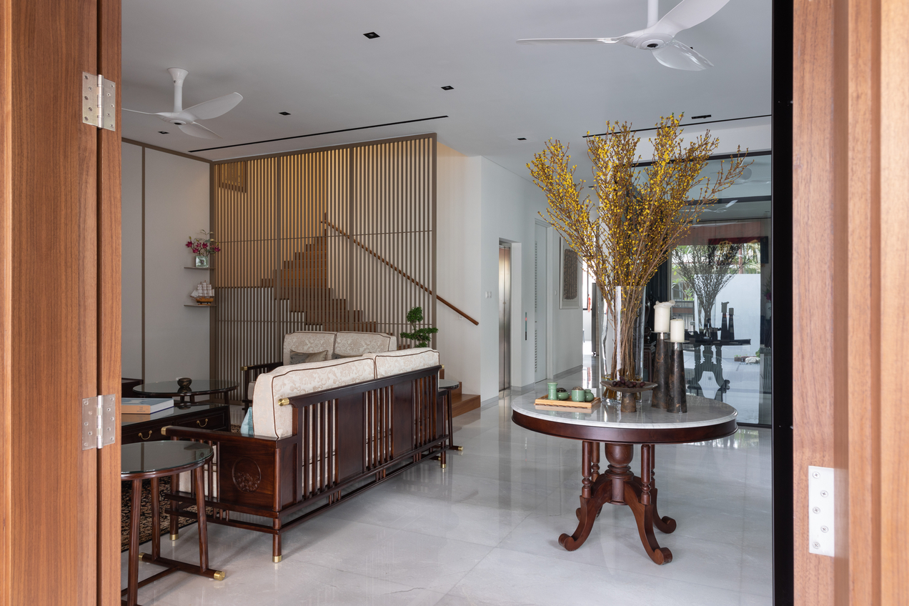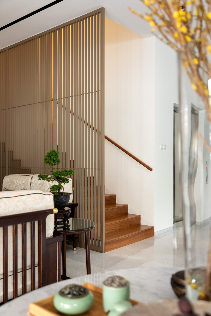 极简主义中融合了具有南洋风味的家具摆设和藏品,一栋新建的三层楼半独立式洋房在风水师和建筑师的建议和设计下,被打造成同时具备新旧元素的居所。