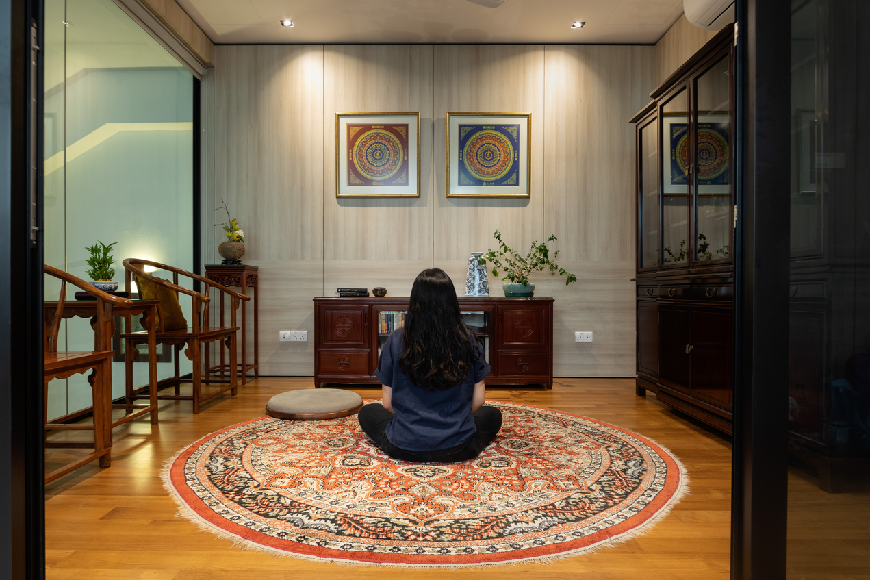 这栋三层楼半独立式洋房有多达八间房,由于屋主一家人喜欢冥思,一楼延伸自客厅的一个空间被设计成打坐室,另外,同一层楼还有佣人房、二楼的主卧房、女儿睡房、书房,以及另一个打坐空间。