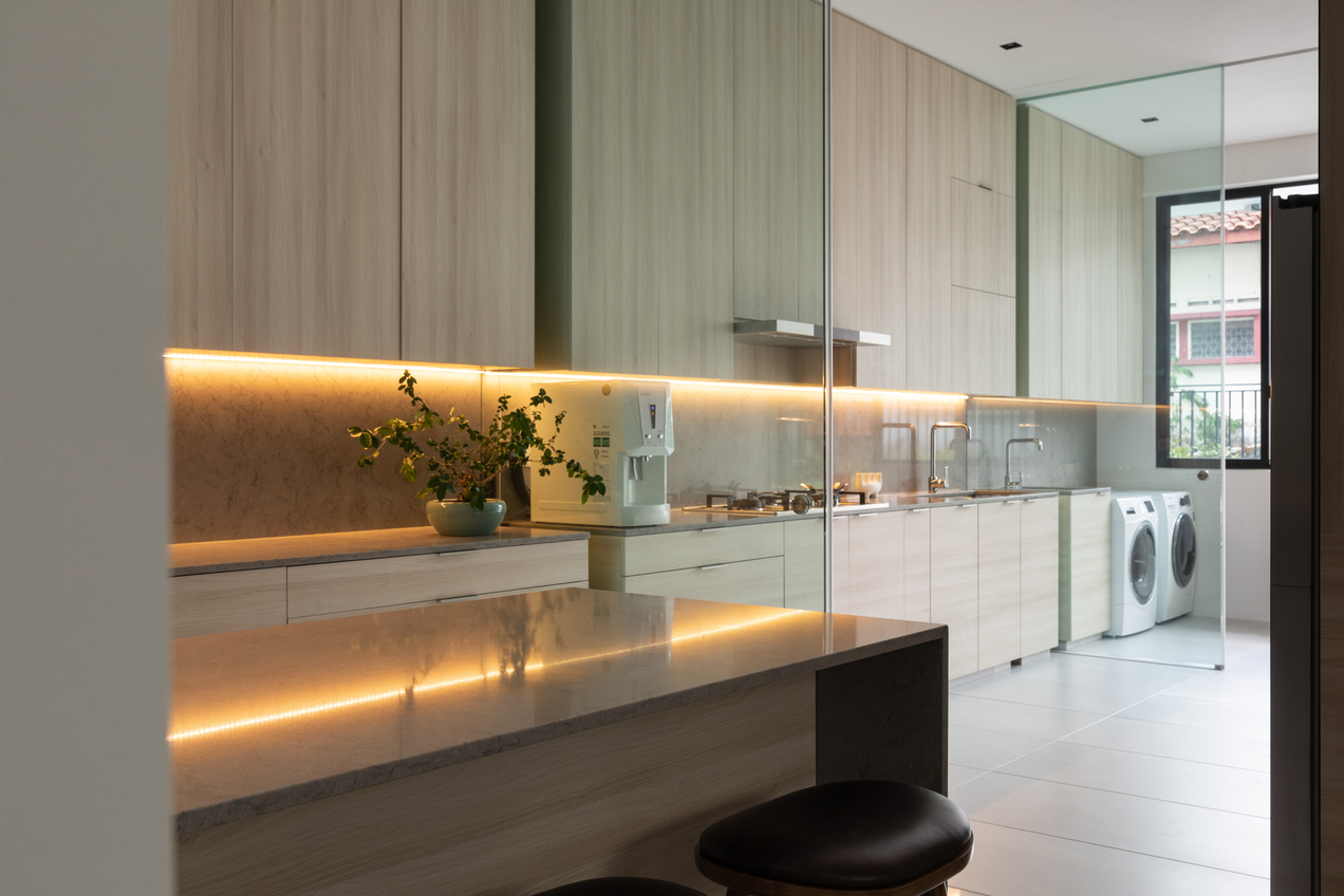 最后是三楼的儿子睡房和客房,整栋房子的空间可说相当充裕。厨房分干湿两区,由一道玻璃门分隔,也是不让冷气外泄的分界线,但还能让自然光渗入。
