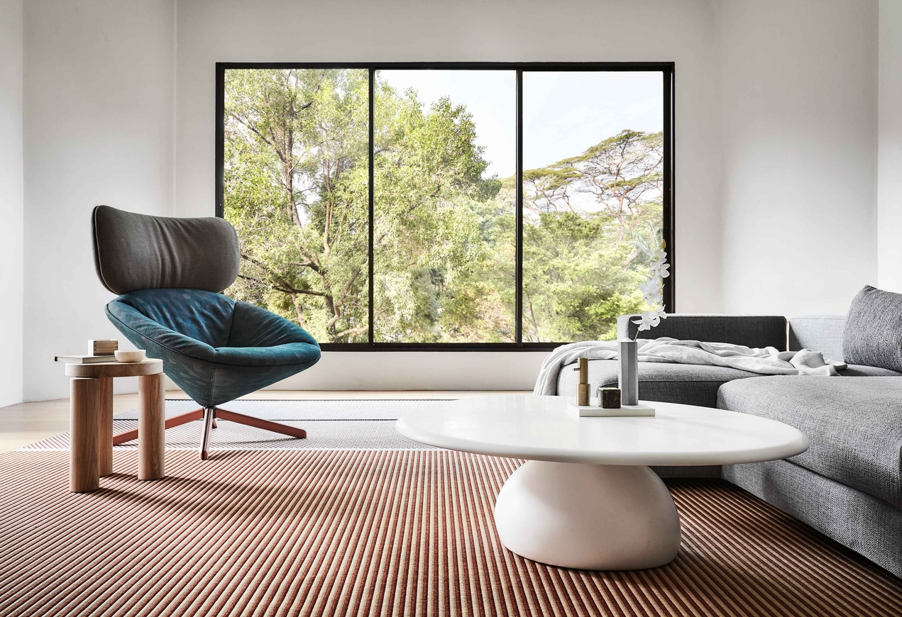 卓康伟在屋中央打造一个升高的地台,宛如传统日本屋里的庭院,也是整间屋子的核心,紧连着周遭所有空间。入门后经过它,下两个台阶才进入嵌入地面的客厅。设计师在这里铺上不同条纹、线条的地毯呼应日本和室的叠席“榻榻米”。极简的空间只摆了灰色矮背组合式长沙发、矮柜、电视和画。黑框玻璃窗户框住屋外大树和绿意,就像日本茶室供茶客欣赏的花道摆设或一幅山水画。