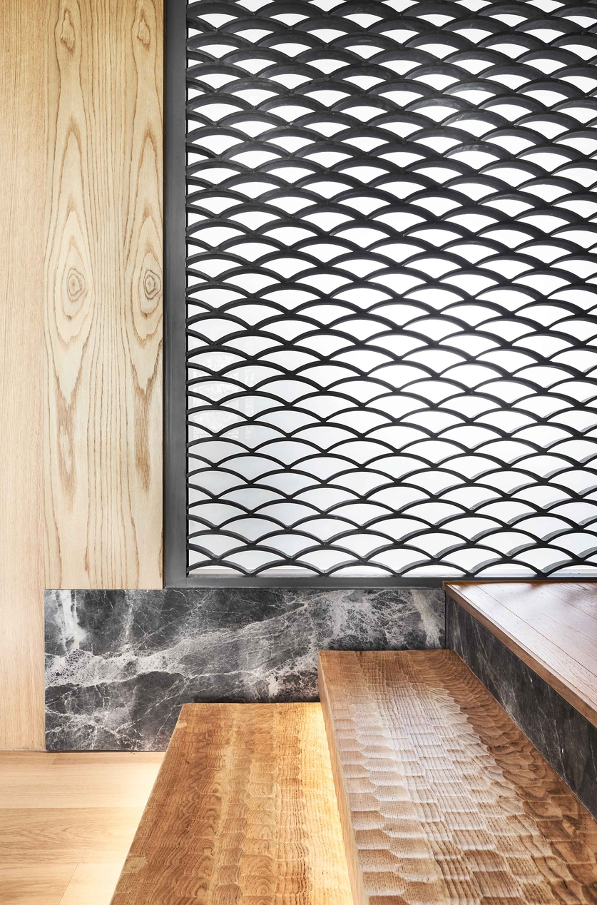 他也聪明地把瓦片参差叠放,制造出镂空的东瀛“青海波”(Seigaiha)图案,框在铁框内,变成区隔饭厅、起居室、卧室卫浴间的屏风。用中国建材创造出东瀛“青海波”波纹,将屋主对中日文化的钟爱完美结合与展现。