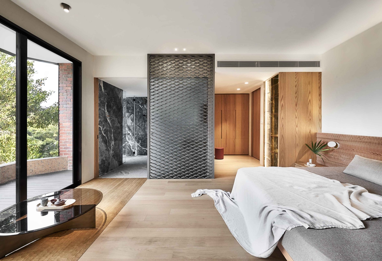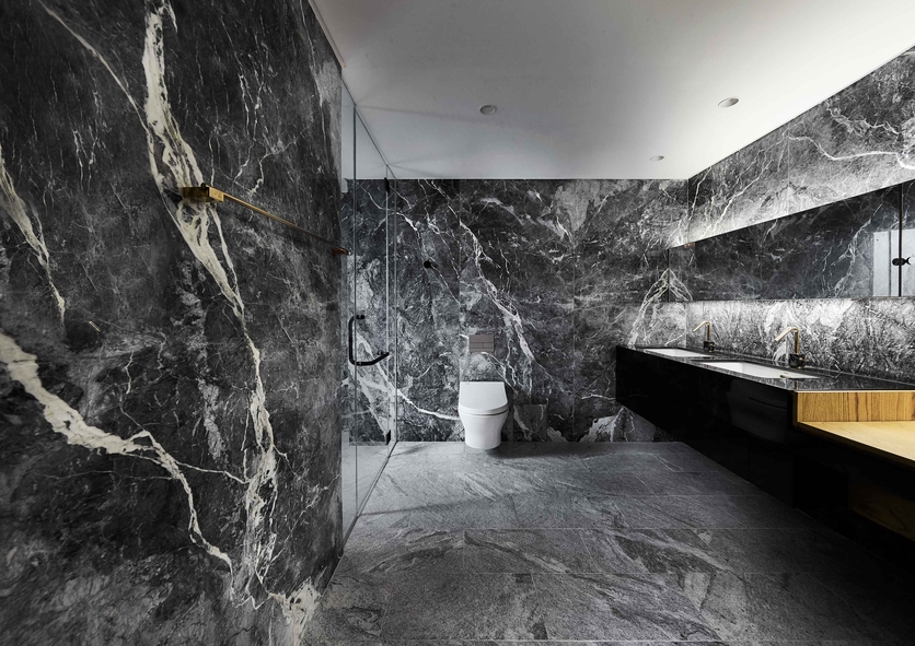 设计师采用狂草、泼墨图纹的大理石来装饰主卧室内的卫浴间。人赤条条在里头,宛如走进一幅绝美的中国水墨画或日本书道字画,在里头洗涤身心,是种撼动心灵的享受。