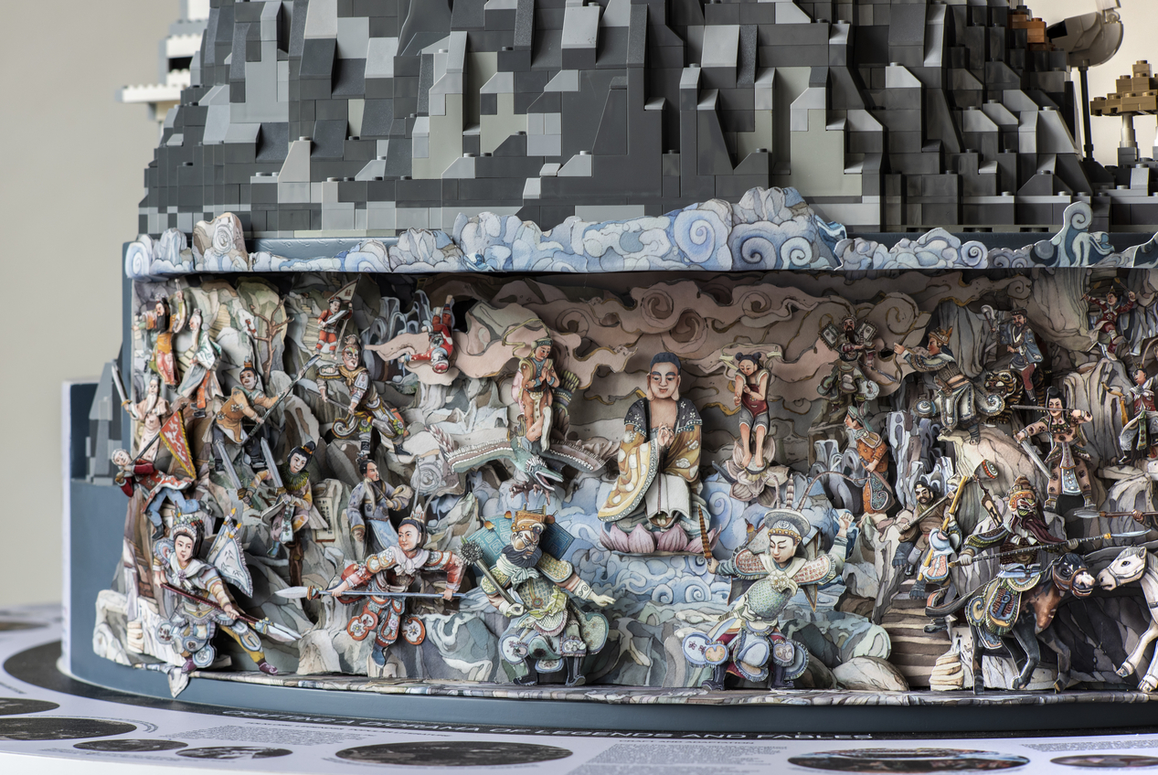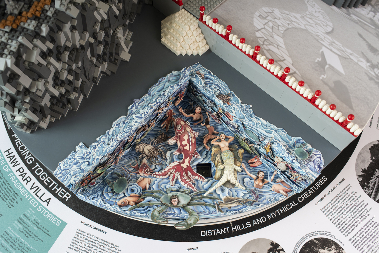 他们请来也是建筑师的本地乐高大师陈大升(Eugene Tan),用乐高砌出毁于二战的艺术装饰风别墅和一面假山与高塔;另外,曾经用动画构想如何保留黄金坊的年轻建筑师艺术家黄信豪(Jerome Ng,33岁)则用纸皮打印立体模型,重现花园里重要的《封神榜》《八仙图》《西游记》,干池里的美人鱼、螃蟹女等园景;以及鲜少曝光的别墅内观。