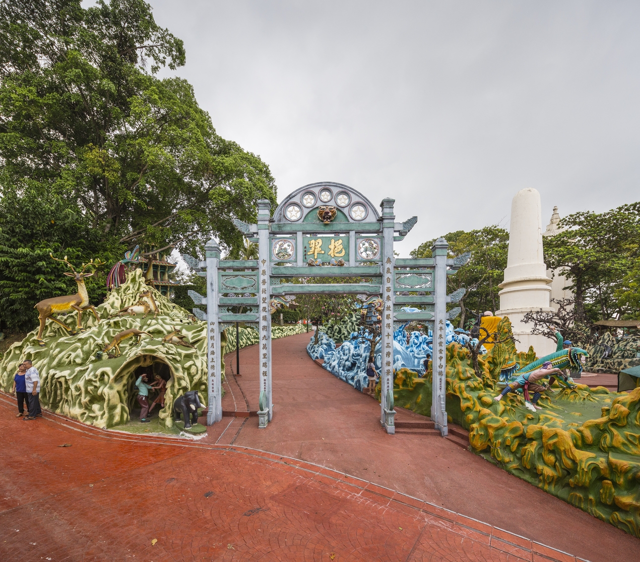 五名汕头工匠所采用的剪粘(也称嵌瓷)传统工艺与粤海清庙相似,是用剪、粘、嵌的手法塑造出园林里栩栩如生的各种雕像。师傅还创意地融入新技巧,如切割彩色玻璃瓶制造龙鳞、鱼鳞。其中一些人物造型与1928年引燃中国武侠神怪热的《火烧红莲寺》人物如出一辙,显然深受电影文化影响。透过他们的妙手巧艺,除了吓坏小孩的十八层地狱,还有栩栩如生的各种华人民间故事,作为一种文化的传承。胡文虎也请来文人为别墅添彩。“挹翠”“棲霞”牌坊,以及门柱对联等,是郁达夫等名家所题,园内许多书法则出自星洲三大书法家许允之、吴纬若、谭恒甫之手。
