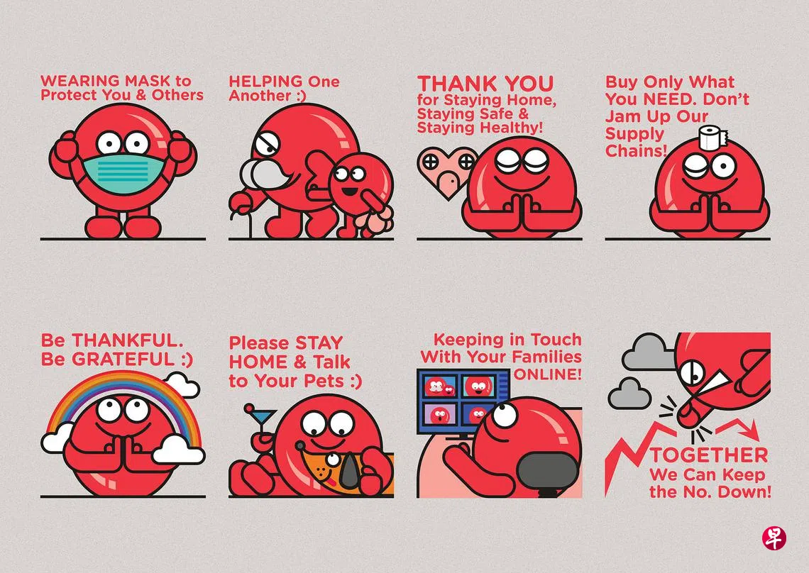 简讯表情包不只是扮可爱,博君一笑,还能传达防疫资讯。去年4月疫情高峰期间,平面设计师许文炳趁新加坡启动阻断措施时,自动自发地设计出以“小红点”为卡通人物的一系列表情包,鼓励国人保持正能量之余,也以媒体新闻为灵感,呼吁国人要勤洗手,保持一米社交距离,莫群居,莫听信散播假新闻等,用幽默有趣的图像帮助国人齐心抗疫。许文炳凭“儿歌邮票”夺下上届文创大赛平面设计组冠军。他目前设计了63个小红点抗疫表情包,透过sticker.ly/s/NAKGFD和sticker.ly/s/WHGXSL两个链接供人免费下载。他说:“若干年后,这套表情包将成为我们一起抗疫的图像历史。”