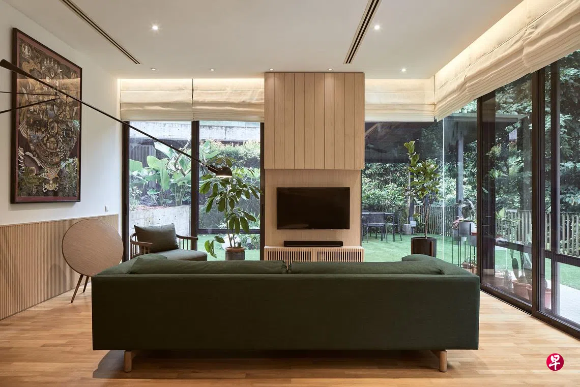 与其在屋内放置植物盆栽,郑永强大量采用实木和木质的镶板装饰室内各个角落,以木代表树木,用取意的方式把屋外的大自然引入室内。他说:“日本建筑师坂茂给了我很大的启发。他说过,当我们使用木材为装修建材,就是将自然融入屋里。”