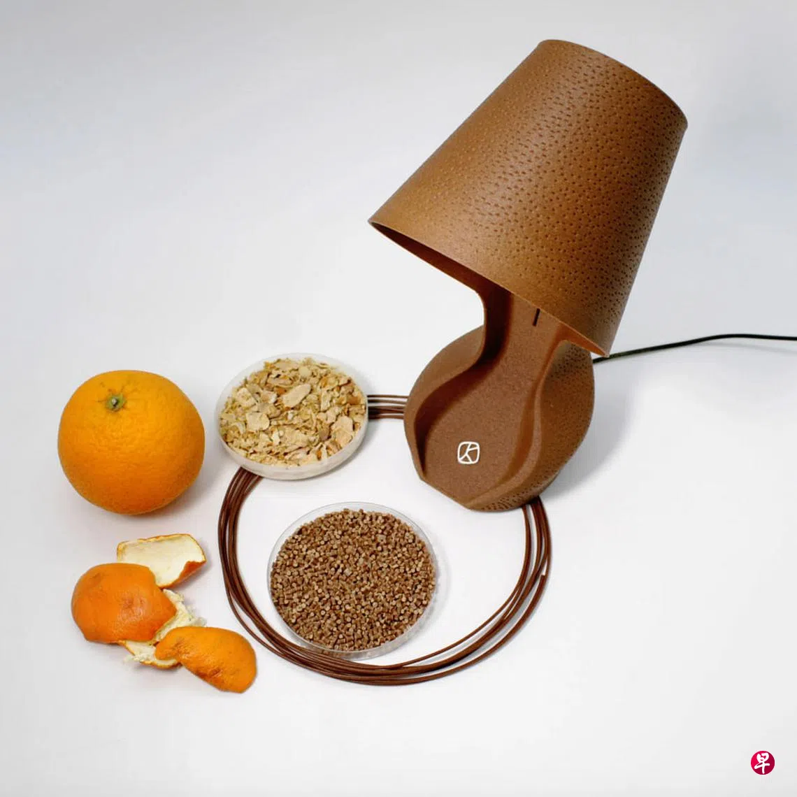 橙皮晒干后不只能入菜、调味,现在也有人用橙皮为原材料,3D打印成小桌灯。米兰起步设计公司Krill Design使用意大利西西里岛盛产的橙为他们的灯具Ohmie提供原材料。他们将橙皮晒干后磨成粉,与植物淀粉浆混合做成原料颗粒,用3D打印科技将这颗粒打印成Ohmie小桌灯。