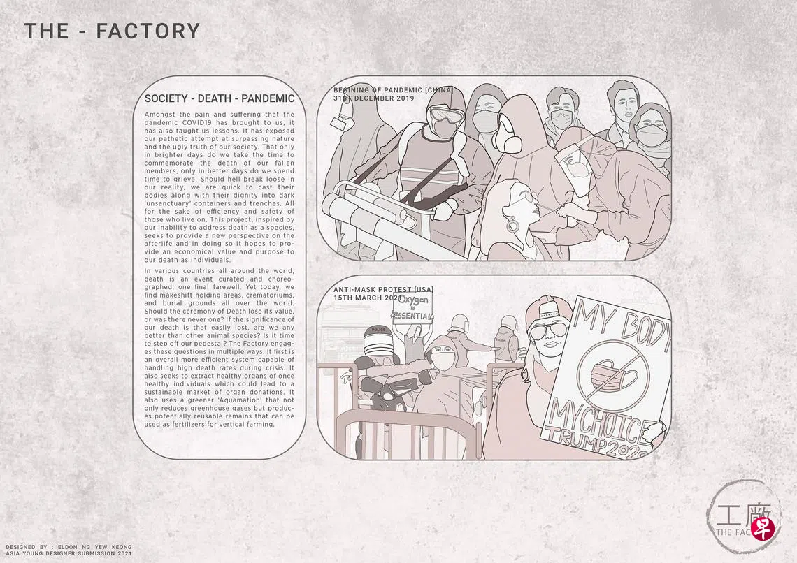 黄耀慷的设计概念“工厂”让人看到赤裸裸的死亡真相,在13个国家地区23名参赛者中脱颖而出,获得2020∕21年度日本漆(Nippon Paint)亚洲青年设计师大奖赛建筑组别的最佳设计影响力奖(Best Design Impact)。