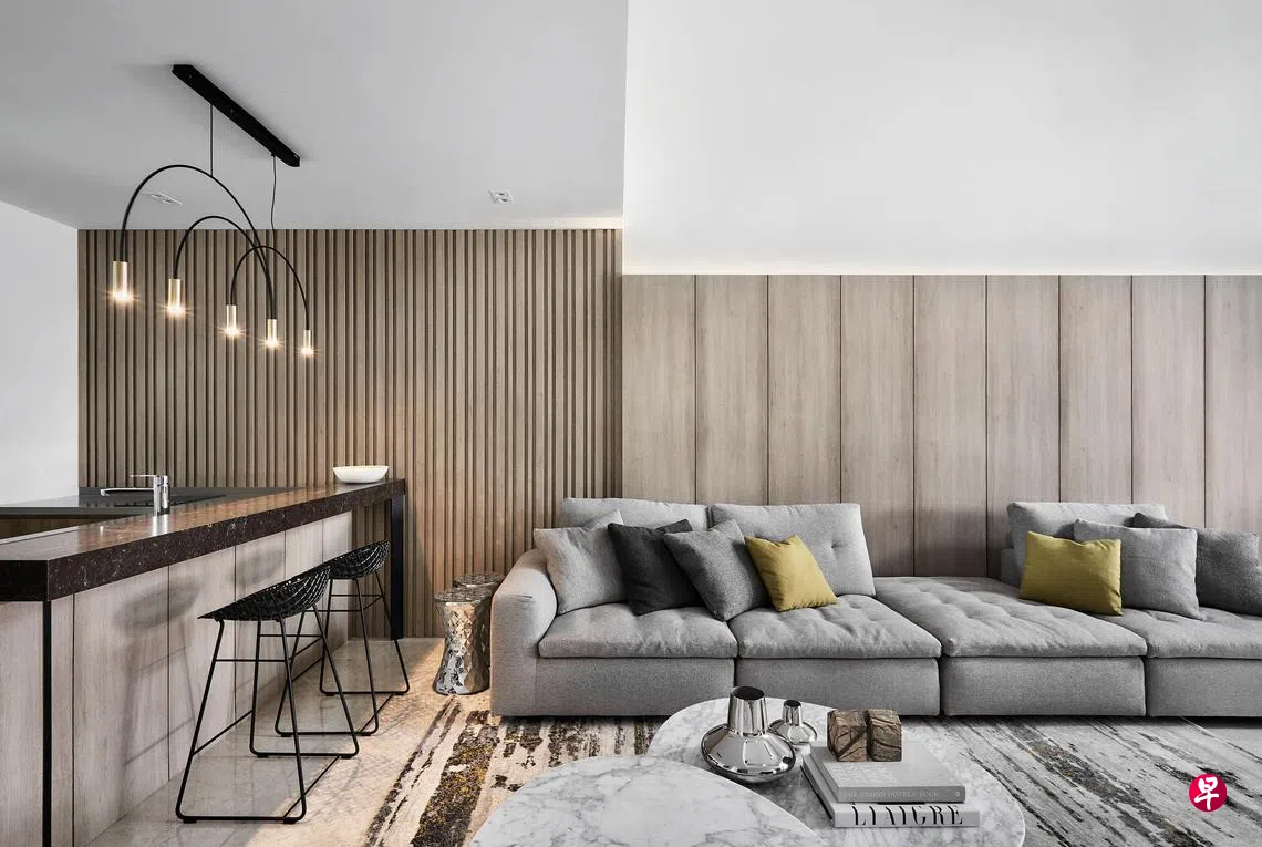 杨世辉说:“我们主要使用白、浅灰和米色,在这三个颜色的深浅之中游移,色系也趋向清雅的颜色,显得更为大气,适合成熟的口味。目前选用的家具如沙发、餐椅、地毯、大理石纹等都是这个色系。另外我们也用宽窄不一的木条装饰客厅、饭厅的整面墙,取代主观感较强的画作,在视觉上打造出中性的主题特色区。墙面的木纹与屋内的木地板相近,白和浅灰的色系也连贯整栋屋子,色调不会显得复杂。清雅的色系比较不容易看腻。要是五六年后看腻了,只要换掉家具,加入不同色系的饰物,如枕头套、铺盖、地毯等,整个空间的感觉又焕然一新了。”