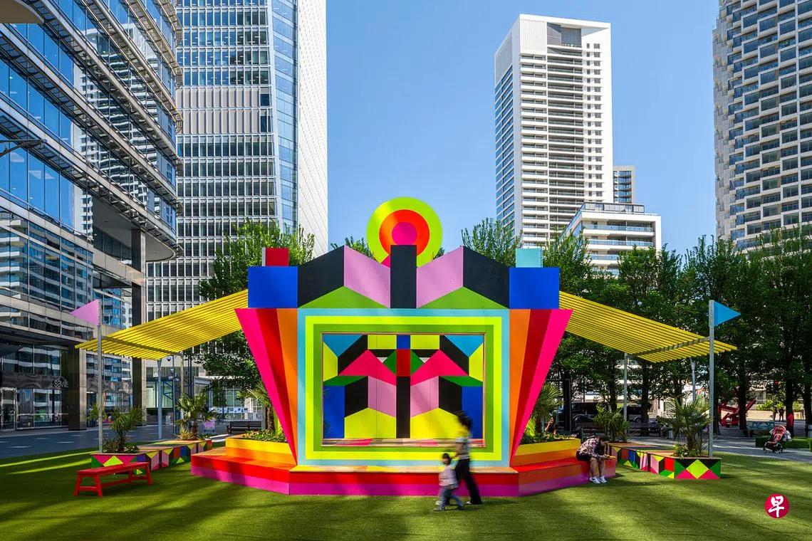 英国艺术家Morag Myerscough五彩缤纷的户外亭子,代表着人们在后冠病时代迈向新生的希望。(网络图)