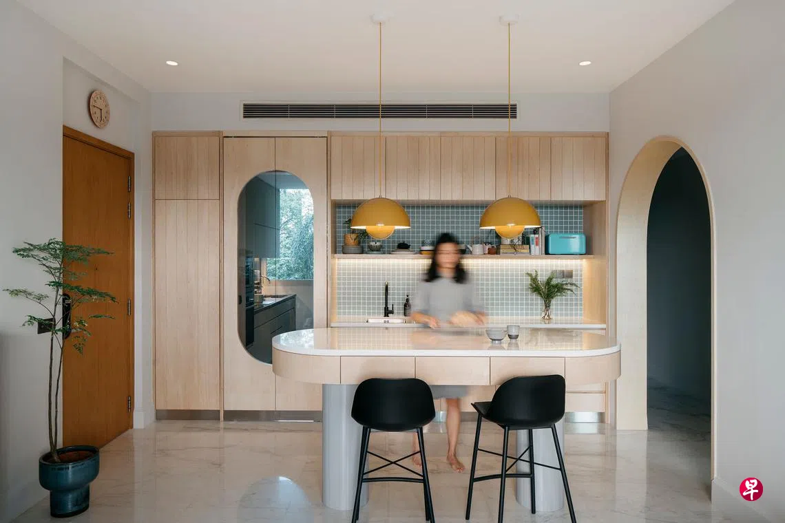 因为读小学的孩子生性好动,怕他横冲直闯时撞伤,屋主要求设计师打造圆角的家具。为此,厨房的中岛式吧台特别做了弧形圆角处理。和大部分定制中岛式吧台不同,这张吧台采用呼应墙壁颜色的一对浅灰色圆脚,而且能随意搬移,日后屋主若搬家,可以带到新家去。