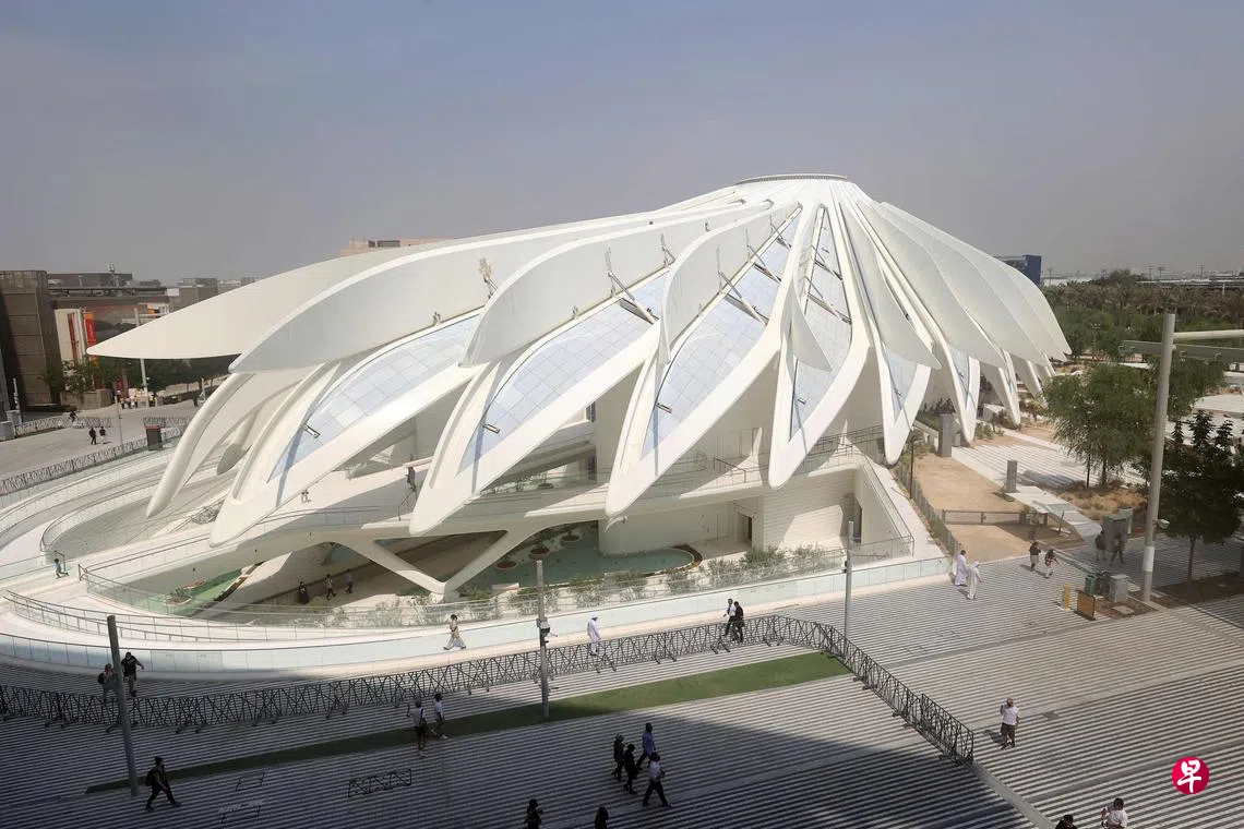 阿拉伯联合酋长国馆请来西班牙建筑师Santiago Calatrava操刀,设计出最炫的国家馆。建筑设计以阿拉伯联合酋长国的国鸟猎隼(Falcon)的翅膀为灵感,更炫的是屋顶上每一“根”遮蔽展馆的“羽毛”能在3分钟内掀起敞开,做出展翅高飞状,将阳光引入室内。室内设计宛如圣洁纯白的圣殿。这超炫的国家馆得天独厚,就设在Al Wasl广场穹顶旁,访客肯定不会错过。