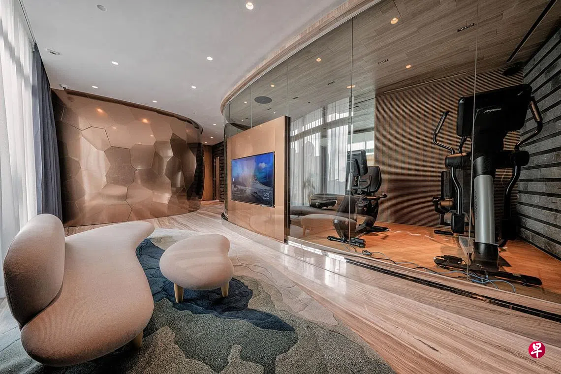 这两栋双层顶楼公寓面向圣约翰岛、金融区和滨海湾金沙酒店,无敌海景非常怡人。房子内共有五间卧房,包个一间主人房、两间儿童房和两间客房。另外还有一间书房、游戏间、健身房、家庭电影室、卡拉OK室、半户外厨房、工作室、户外庭院,外加36平方米的泳池和一个36.5平方米的屋顶花园,各种各样的空间都有,齐全又壮观。