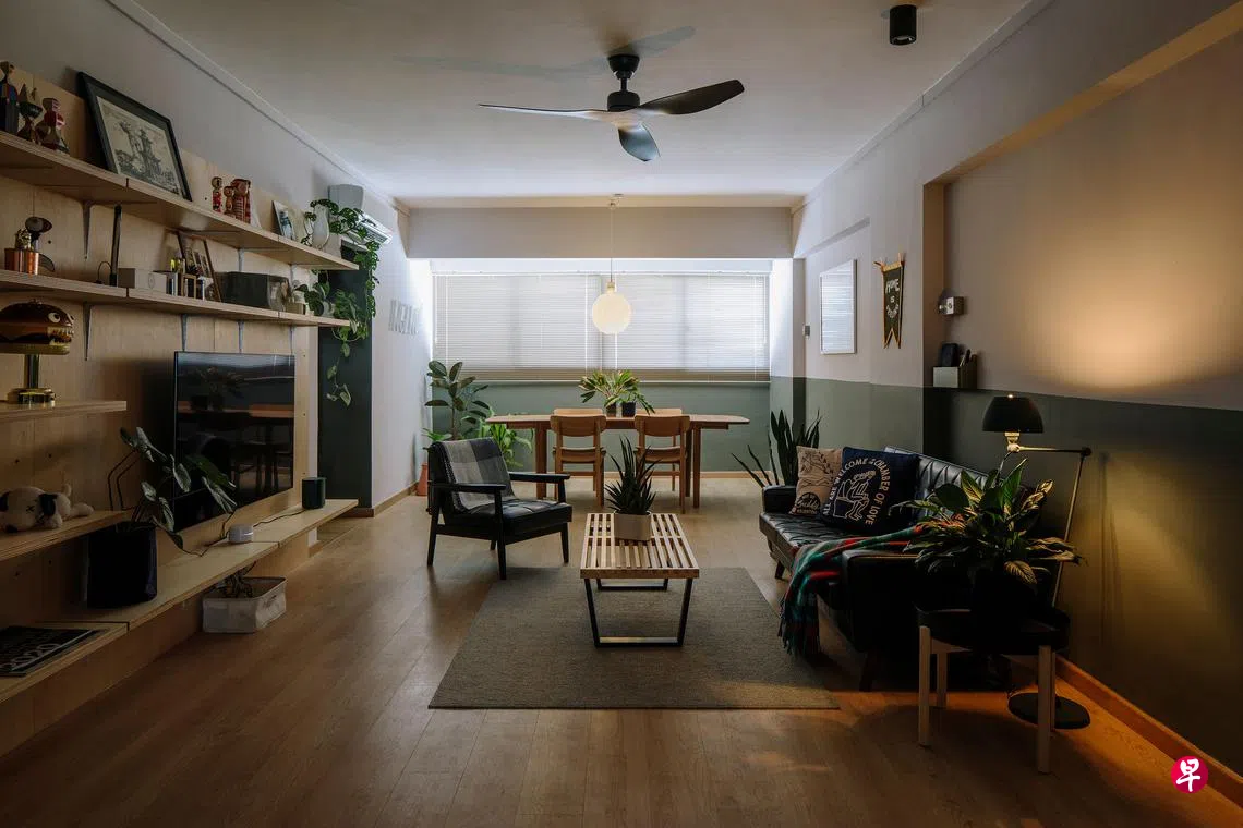 走进这间位于勿洛水池路的五房式组屋,的确有点走进美国野外小木屋的感觉,或许这正是它给人介于户内外的印象。细看之下,这印象也来自屋主大量使用原色木板制作的家具和地板。除了客饭厅的栎木地板、全木饭桌椅外,客厅还有一面几乎全用木板铺饰的墙,设计师用L形铁托架和木板在一片大木板上分隔成五层的书架、橱架,成为客厅一抹亮眼的特色。