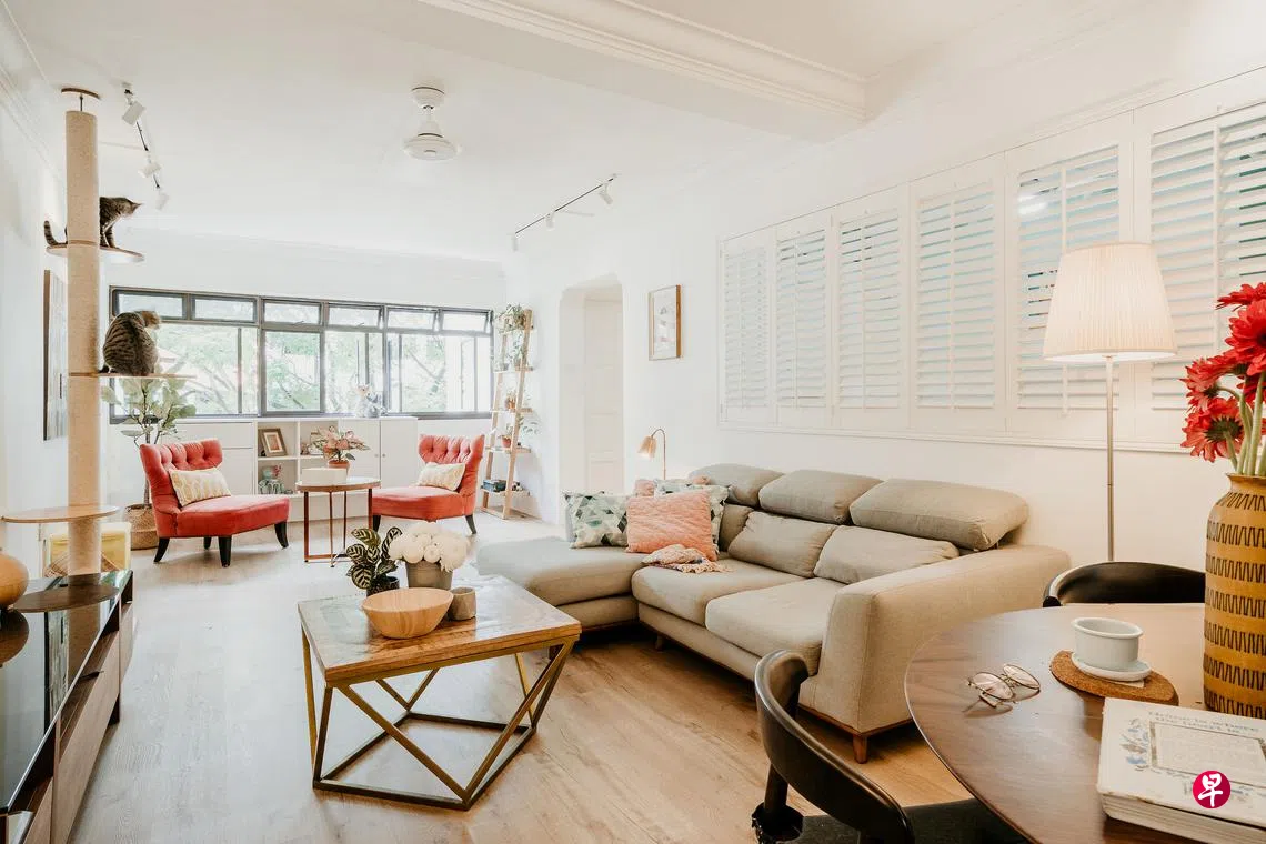 客厅背后那一排乳白色的百叶窗很吸睛,马上为客厅增添南洋庄园的特色。原来那一排窗后不是户外,而是女主人做手工艺的房间。当她不在家时,这手工房就变成三只猫的房间。把猫儿关进这房间,是因为百叶窗能透气,也能望到客厅,敞开客厅的窗户可让屋子透气,又不用担心猫咪会不小心跌出窗外。