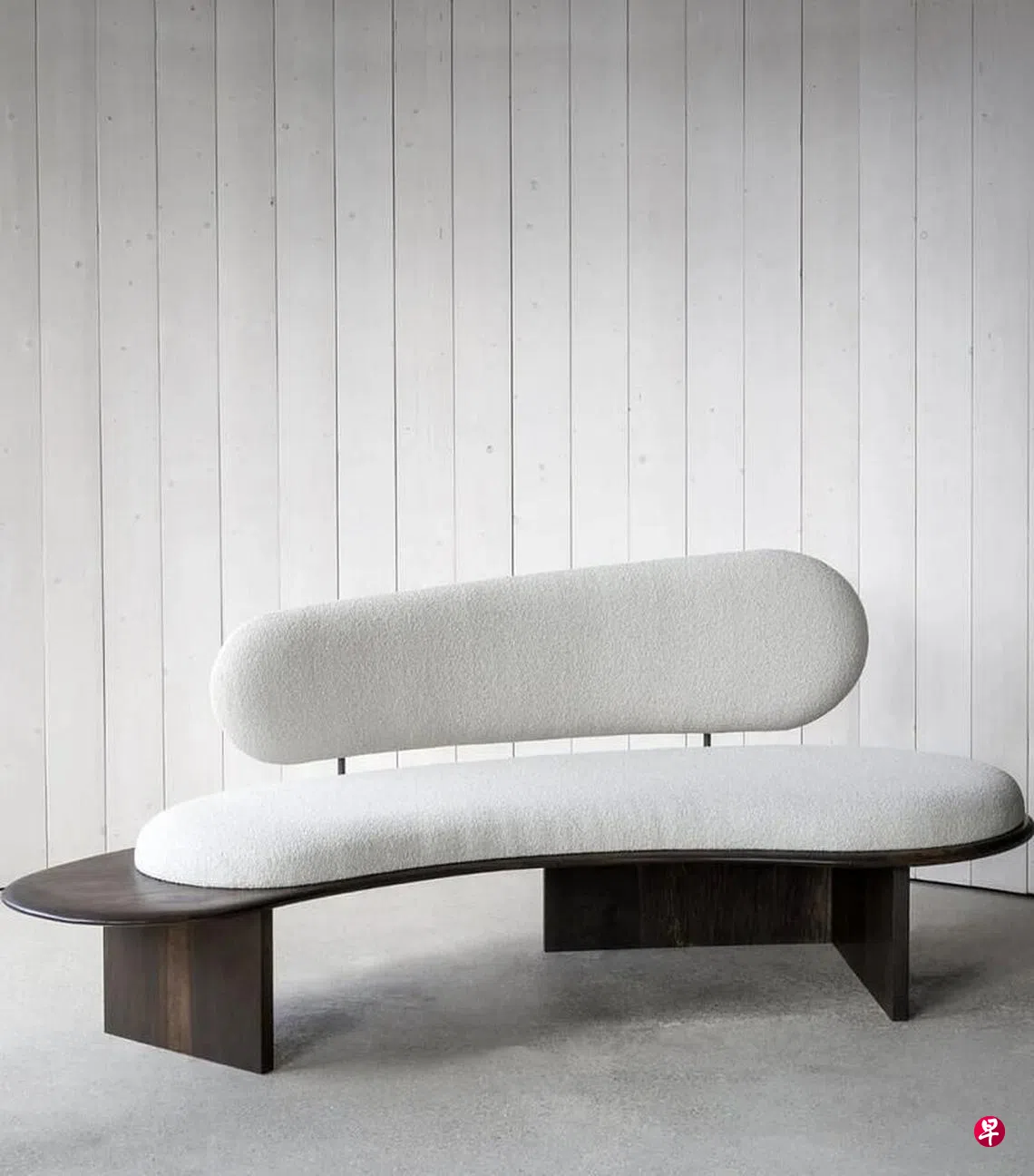 其中有几件产品,特别令人印象深刻,比如“鹅卵石沙发”,就像海滩上的鹅卵石一样,设计师希望将纹路丰富的乌木与质感十足的奶油色织物结合起来,两者都有自然的弧度,就像被大海风化一样。融入沙发中的边桌,打破了人们对沙发的传统观念。