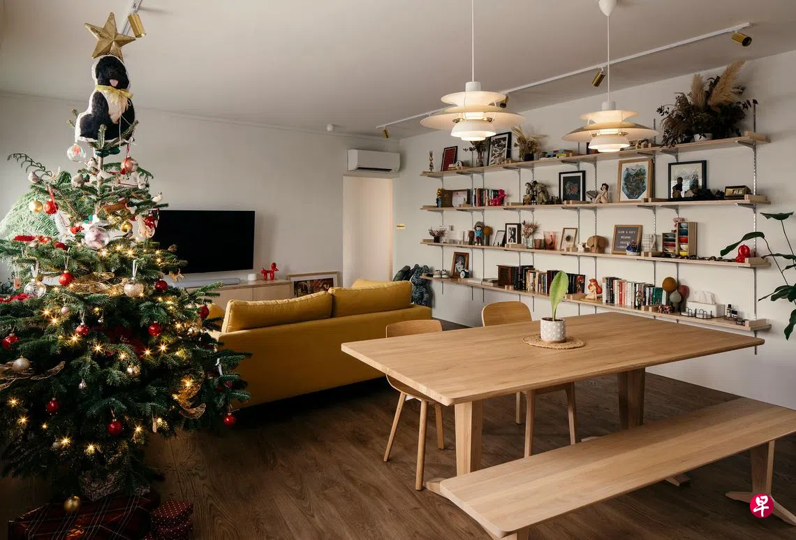 这个单位客厅的主题书架似曾相识,郑永强说,灵感正是取自大师的书架,但用胶合板取代铁架,背后用铁框托起木架,给人简约的现代感,很受年轻屋主欢迎,同时也延续屋子的主要色调。书架上摆满屋主收藏的公仔、书籍和家饰品,琳琅满目。书架就在沙发与饭桌之间,成为客饭厅视线的焦点。