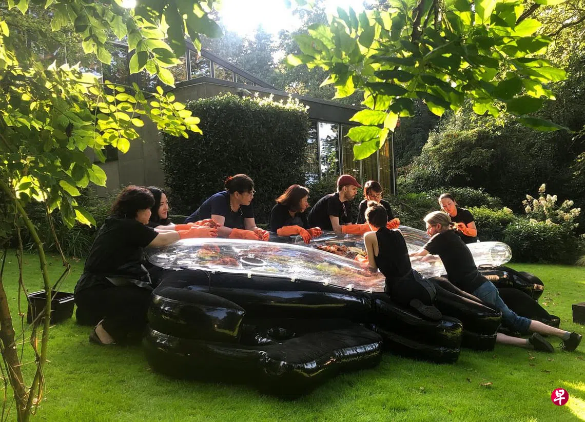 “泡菜池”可让12人围着制作泡菜,充气池里不同功能的座位可坐、跪或趴着,重现韩国家庭围坐制泡菜,其乐融融的气氛。梯田造型的“面包沙发”,让面包匠人在等待面团发酵时小睡片刻。照片里的面包师傅抱着面团小睡,十分逗趣。“芝士台”跟“面包沙发”的原理相同,但体积较小,附有小台面供制作黎巴嫩软芝士Labneh。