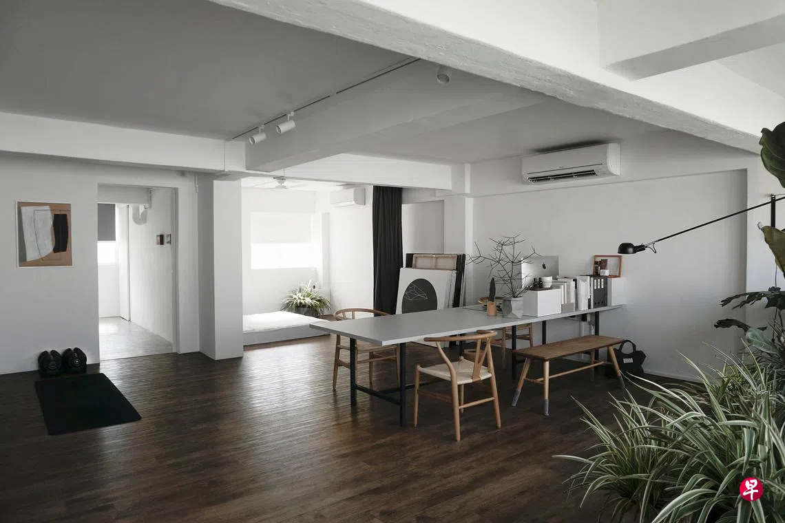 全面翻新装修的房子很清楚看得出设计的主题是简约开阔(Minimal & Open),在三房式的组屋里塑造一览无遗的视觉感,并且能按着工作、生活、聚餐等不同的需求灵活运用空间。谢振凯说,他最大的考量是那些要打通的隔墙是否属于结构性隔墙(structural wall),因为若是,就不能打掉。所幸整个过程没碰到问题,最后是原来分隔两间卧室和客厅的墙壁被打通成一个大空间,看起来就像一室公寓。