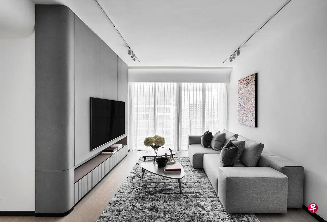 这屋主是30出头的年轻夫妇,育有两个孩子,灰色虽出于风水考量,但恰好也很合他们的品味,为他们绘出一间极摩登和时尚的现代家居。