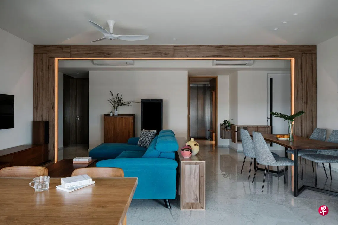 这扇用核桃木纹美耐板的门框,成了公寓中重要的空间规划策略,为整体空间梳理出有意义的层次感。