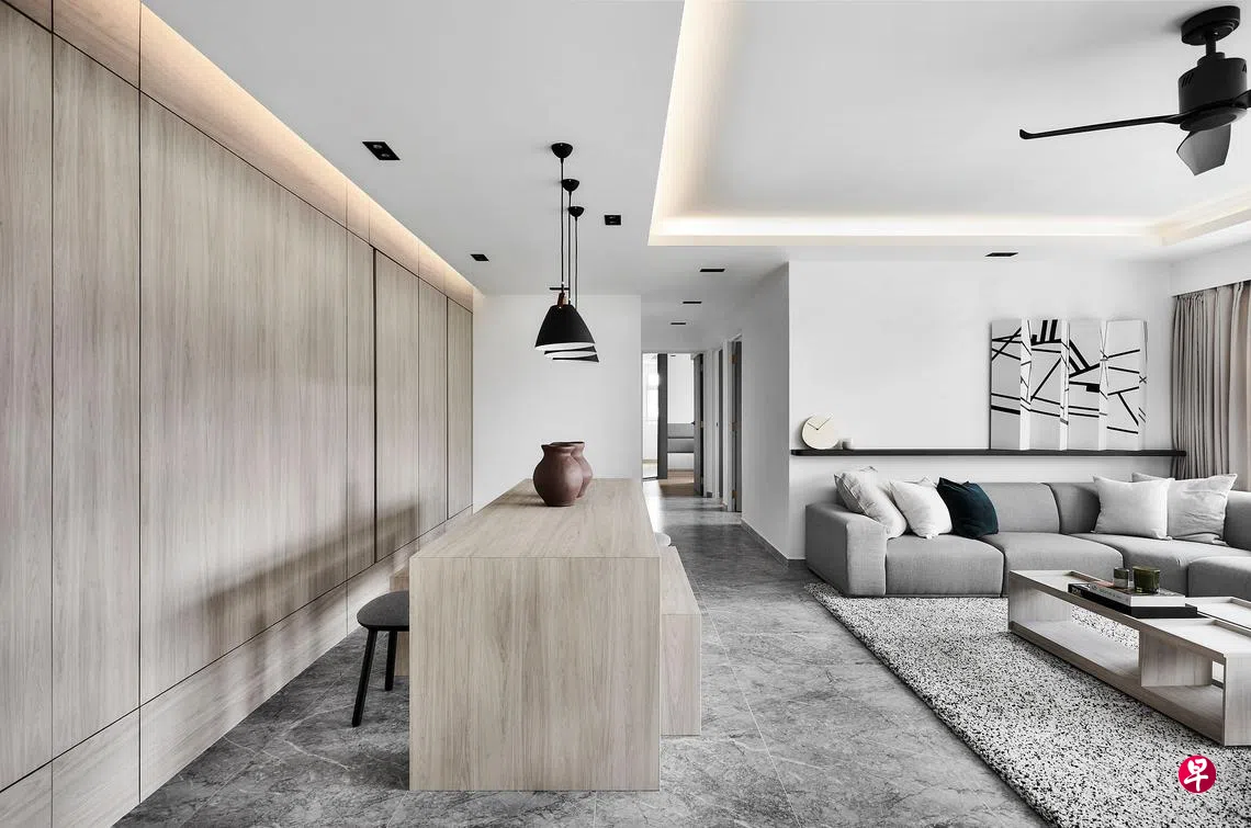 另个主要设计亮点,是用餐区和客厅被打造为一个共同互动的大空间。这个宽敞的二合一空间,同时能充当小朋友玩乐的地方,让屋主夫妇在用餐的同时,也能照顾小孩。客厅沙发墙上的简约风条纹设计,有画龙点睛之效。用餐区的长形餐桌,在亲友聚会时可做延伸,灵活容纳更多宾客。近年来因疫情不少人居家办公,这张长桌就派上用场,摇身一变为办公桌,屋主边办公边“监督”孩子。