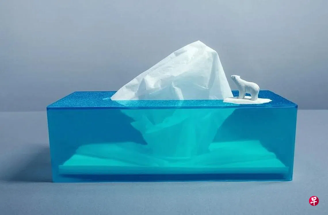 另外,在抽取口旁再放上一只呆萌看着面纸的北极熊,相当可爱。这款创意小物有一个深层的巧思,艺术家之所以将北极熊放置在抽取口,目的是要营造出北极熊的孤独与害怕。每当抽取完一张面纸就仿佛少了一座冰山,这让人联想到现在地球暖化导致北极海冰融化、冰盖面积缩小的严重性,的确值得省思。一份科研报告称,如果人类对于温室气体的排放量不认真加以控制,北极冰川2040年前后将会全部融化,化成一片寒冷的汪洋大海。