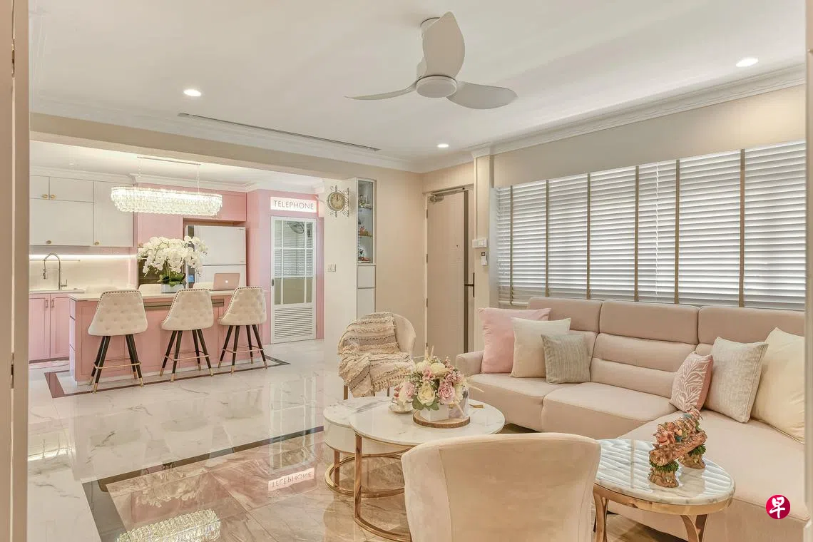 梁慧菁说:“业主想要拥有一个迪士尼童话故事概念的住宅,并尽情展示收藏品。另外,倾向使用柔和的粉红色、白色和大理石纹理色调及些许金色的配饰元素。相当有趣的一点是,三人想在起居区创造一个‘电话亭’,以在融起居、用餐和厨房的大空间中提供隐私。”
