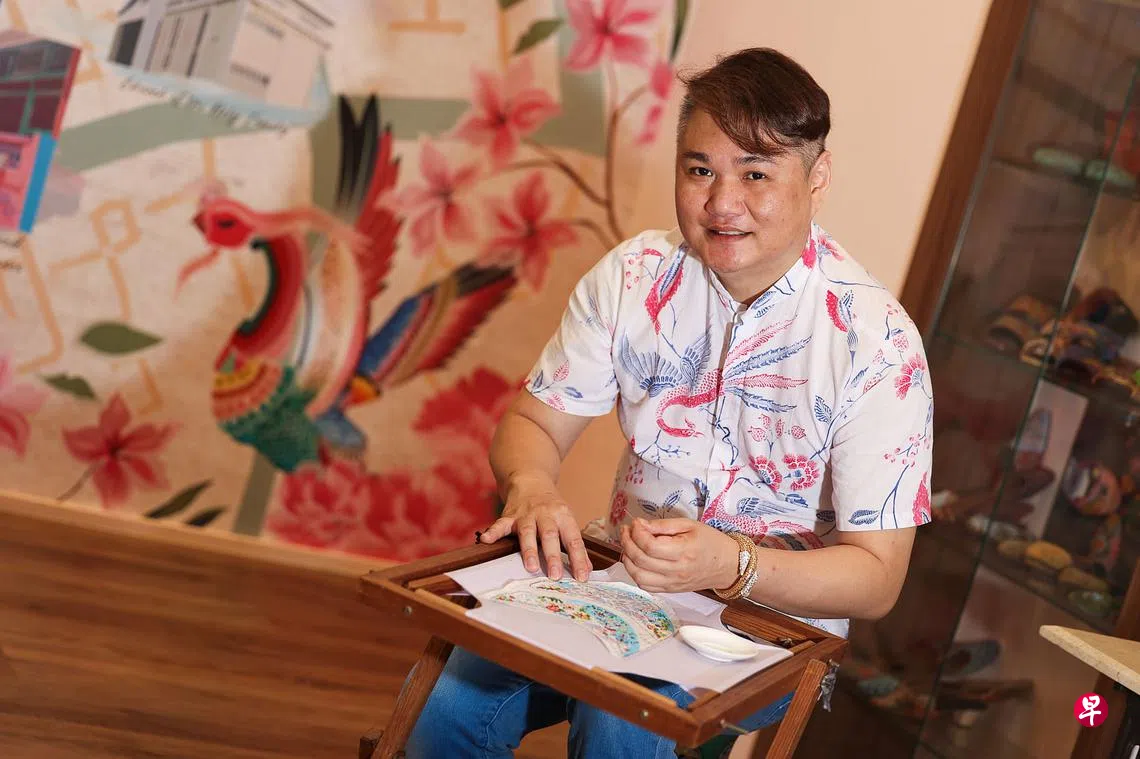 他说:“我在这过程中接触到娘惹珠鞋,很好奇这么一小片的珠绣面怎会卖得那么贵,于是找到一名教会的阿姨教我。旧时出嫁的娘惹会亲自制作一双珠绣男鞋给夫婿,我就尝试制作一双男用珠绣鞋给自己。我在中学修读美术,虽然有底,但一双鞋就做了一年半,让我深深地领略到娘惹珠绣技艺之精致,成品之美。”