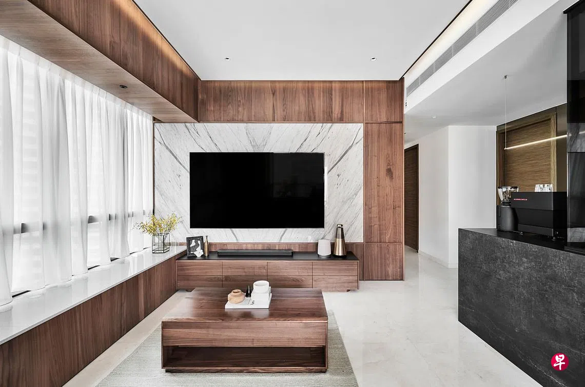 “在不破坏任何现有结构、布局的前提下,引入完整的设计,的确是一个挑战。”伊恩说:“由于空间限制,我们没有空间盈余在房间周遭建造任何全高橱柜。我们建议在客厅、厨房和主卧等主要区域周围做精确的包层(cladding)覆盖,以在这个紧凑的生活空间中带出空间的深度。棘手的部分,是如何在相对紧密的布局中,将不同的材料巧妙分层,并保持微妙美学。”