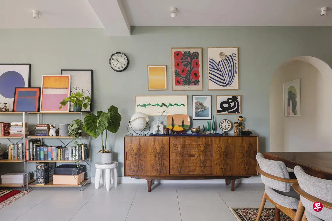 操刀室内设计的Monocot Studio为这个位于实乞纳(Siglap)的公寓式单位,打造画廊式的设计概念,让屋主得以展示他们的艺术收藏品。墙壁特别选用粉绿色,Monocot Studio创办人郑永强说,那是20世纪中期的流行颜色,跟丹麦的家具很搭配,目前在北欧国家依然很受欢迎,被视为有个性的柔和颜色。这款粉绿色显得较为低调顺和,不单能够凸显墙上的画作,同时跟地上的灰色砖块额外搭配。