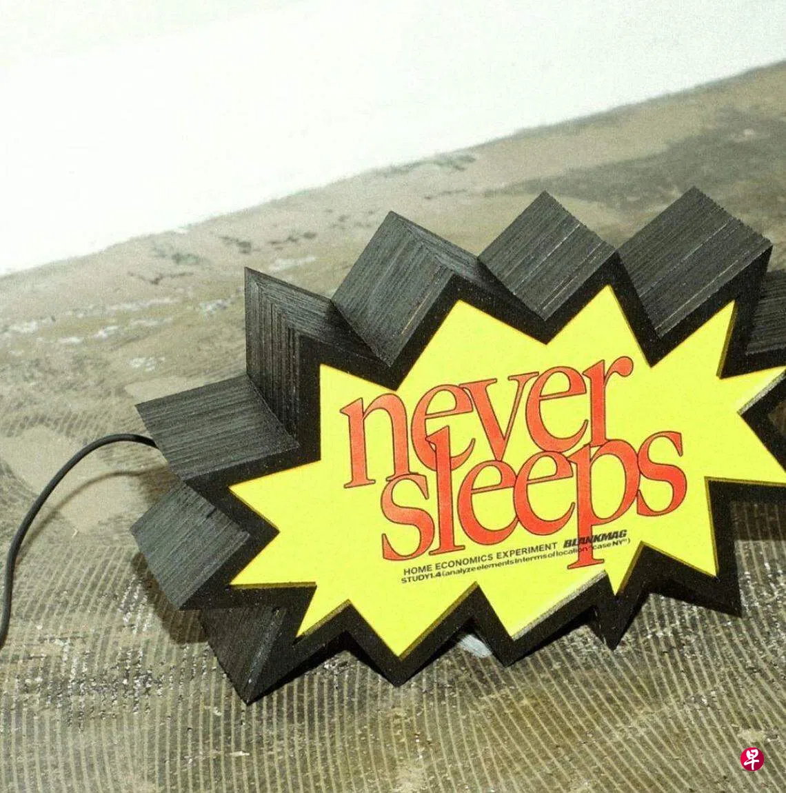 这次合作,进一步将Blankmag多年来重视的美式街头文化元素融入作品中,双方升级再造出椅子、书桌、灯具、印花T恤等系列联名单品,用废料和即将废弃的材料等做各种加工,增加新价值,如印有英文字母“never sleeps”的灯具,像是通过鲜艳的红色与黄色,表现出熬夜的决心,别有趣味。