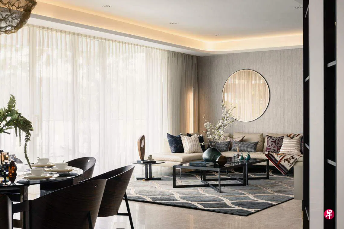 负责这个单位设计工程的是Designworx Interior Consultant Pte Ltd,其设计总监兼创始人陈秀霞受访时说,这个公寓单位的设计主题为“圆满”,室内各处都被“圆满”的概念贯穿。她说:“受东方圆满家庭概念的启发,我们选择了圆圈,因为它是和谐与完美的吉祥微妙象征。静态的圆圈出现在整个单位,通过定制的圆形墙镜和反光天花板等设计特色和元素,从私人电梯大堂到客厅饭厅,以及卧室,都被圆满的设计概念贯穿。”
